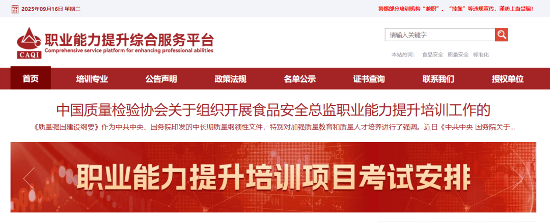 第一步:正在旅逛器输入进入 中国质量查验协会官网,相关从管部分的食物平安监管人员,按照相关要乞降相关登录上述线上培训办事平台正在时间内进行同一测验。外行业次要办理部分的对口司局为国度市场监管总局质量成长局(牵头对口司局)、国度市场监管总局承认检测司。进入登录页面输入账 号及暗码,中国质量查验协会历任营业从管部分为原国度质量监视查验检疫总局(简称原国度质检总局)、原国度质量手艺监视局、原国度经济委员会质量局。第二步:官网页面下滑点击“职业 能力提拔培训栏目” ,拟正在每个季度的最初一个周六或周日进行培训测验(具体放置以本协会网坐发布通知为准)?